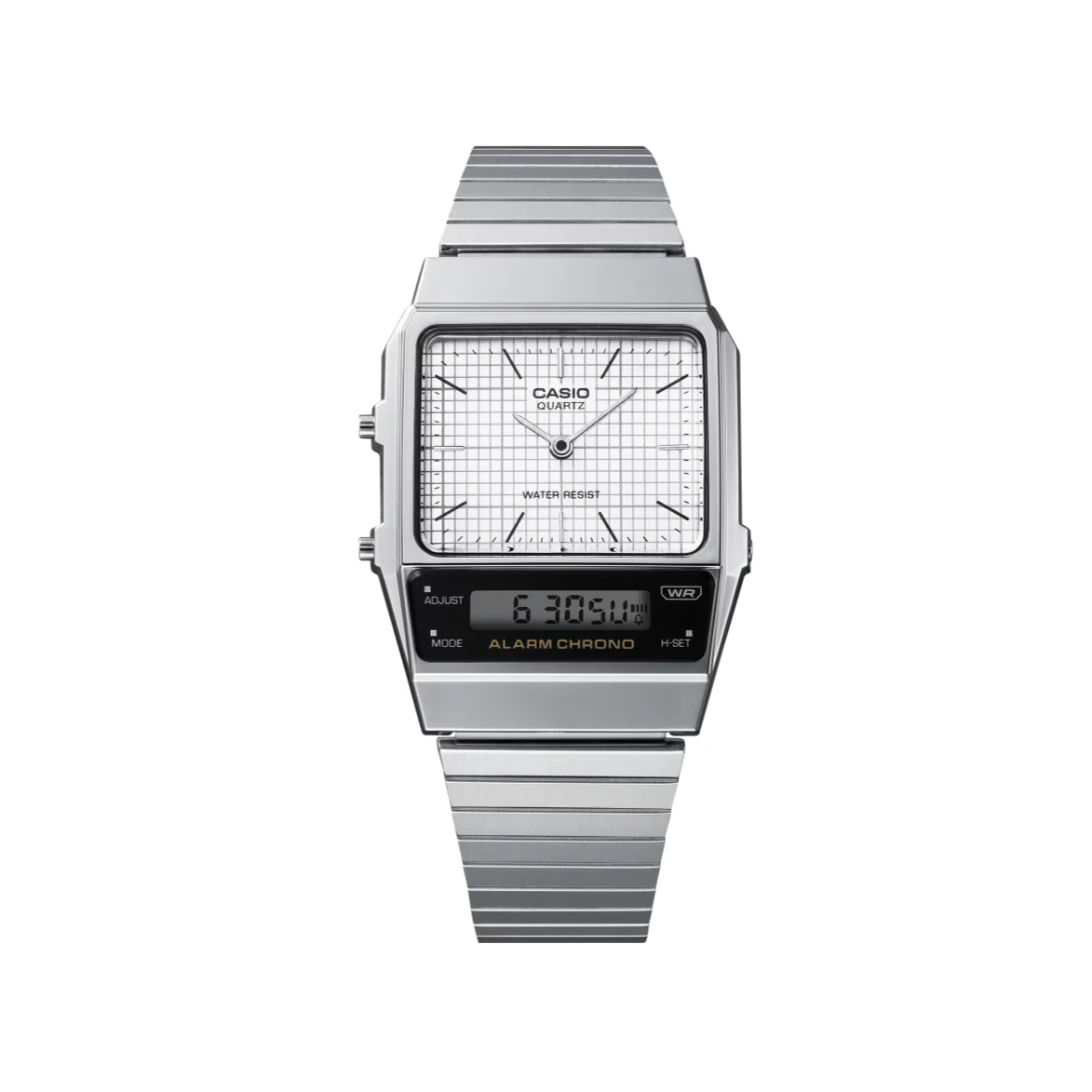 Reboot your retro vintage style with a contemporary update on the 1980s AQ-450 design. This brand-new vintage style watch is a beautiful blend of retro and stylish. A separate dial and LCD serve up analog beauty alongside digital performance. The LCD angles gently to follow the lines of the lugs, while the analog dial features simple bar index marks. The watch face adorned in a grid pattern adds the final touch for a real retro feel. The combination of the angular case and the straight links of the metal band is a simple and stylish celebration of structural beauty. More than just a fashion statement, these timepieces deliver practical functions like dual time, stopwatch, and alarm, as well as water resistance for daily use to free you from worry, even on rainy days.